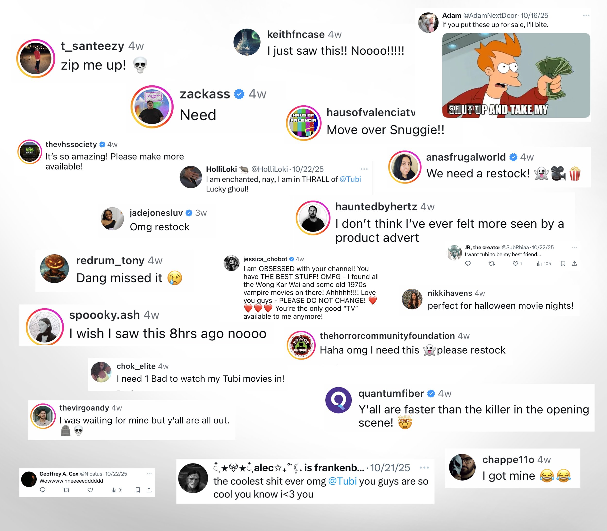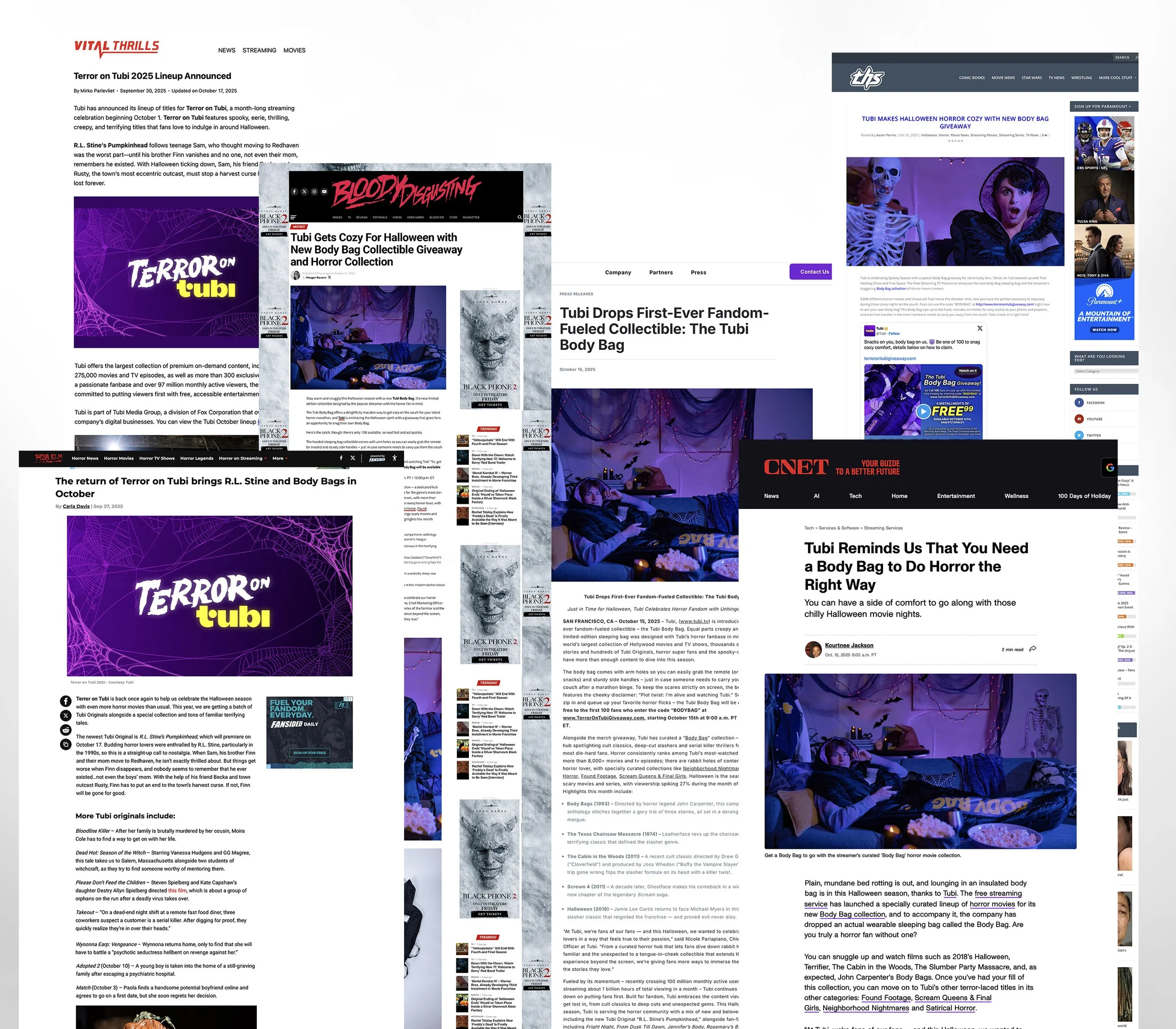 Tubi is a free streaming platform known for both having the largest collection of content and the most niche, unapologetically odd titles. When they came to us asking to create an earned activation centered around horror season, we didn’t disappoint. The Tubi Body Bag was a limited-edition sleeping bag created to welcome our oddly specific audience members and give them the feeling of belonging and coziness while they get to binge watch their favorite scaries. Not only did these disappear within 90 minutes, they inspired Tubi to create yet another sub-genre within the platform itself: The Body Bag Collection.